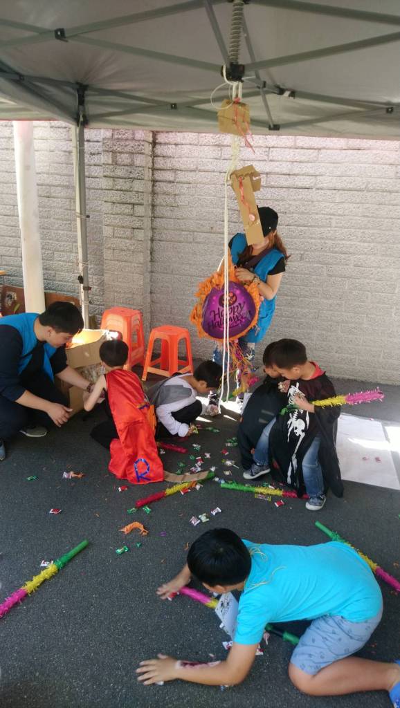 闖關遊戲令人沉迷其中。孩子們擊打墨西哥傳統的 Piñata 玩偶,搶著掉落在地上的糖果,超開心的。