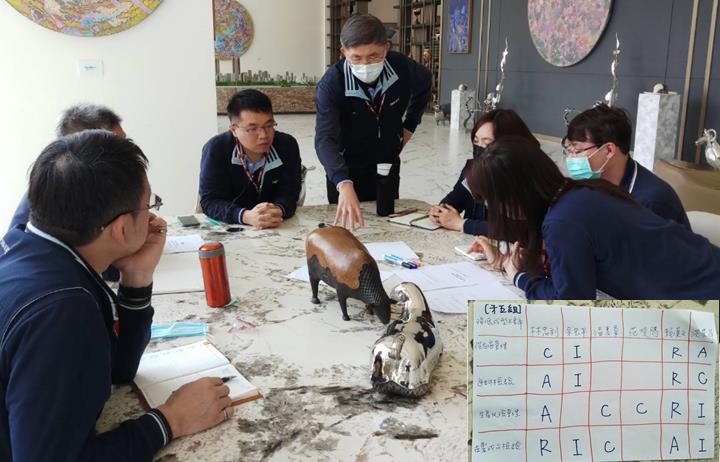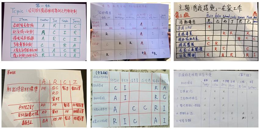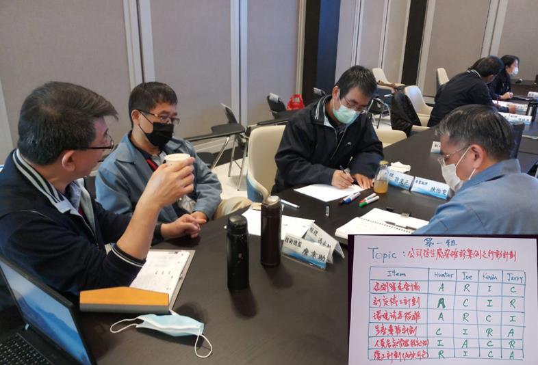 課程的下半場,進行分組演練【ARCI】工具的運用,時間雖然不多,但六組人馬都充分發揮多年來做報告的本事,立即啟動腦力激盪和熱烈討論,雖有摸索和困惑,過程中有的報告重做了幾次才定稿,有的搶在最後一分鐘更新版本,各組都希望在有限的時間內將報告做到最好。