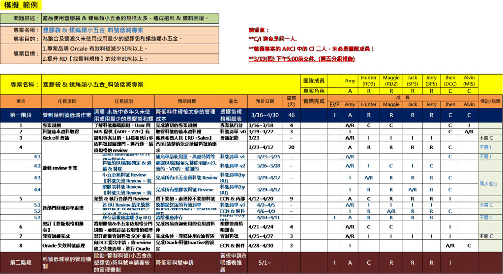 會後執行副總立即指派小編將【ARCI】矩陣圖的製作重點做成範例以及空白格式給各小組參考使用,內容經過執行副總的指導和陳博的同意後,立即向大家召開說明會,請各組依據共同的格式,重置自己的專案規劃,也期望各組【ARCI】規劃的內容和產出可以一次到位。