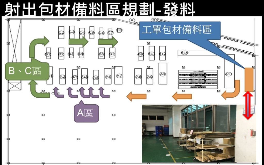 在尚未規劃改善前,射出包材料件一日量全部放置於包材備料區,作業人員依工單尋找出包材後自行來拉料,將整個工單的包材一次全拉到搭配工單射出機檯旁,以便生產使用,既造成生產空間凌亂又會有作業人員拉錯料的風險。
