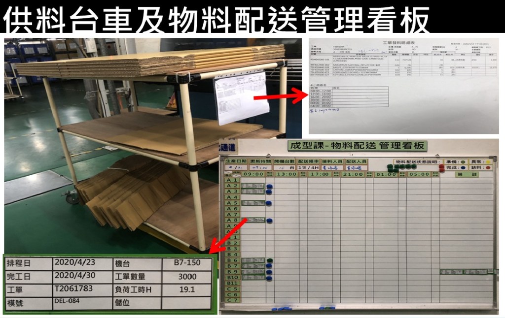 小組成員集合採購、生管、倉管、成型專業人員,從最初流程規劃到備料台車設計及製作,還有備料看板的製作,最後試RUN的問題討論及修改…等,大家都發揮了最專業和負責的精神。