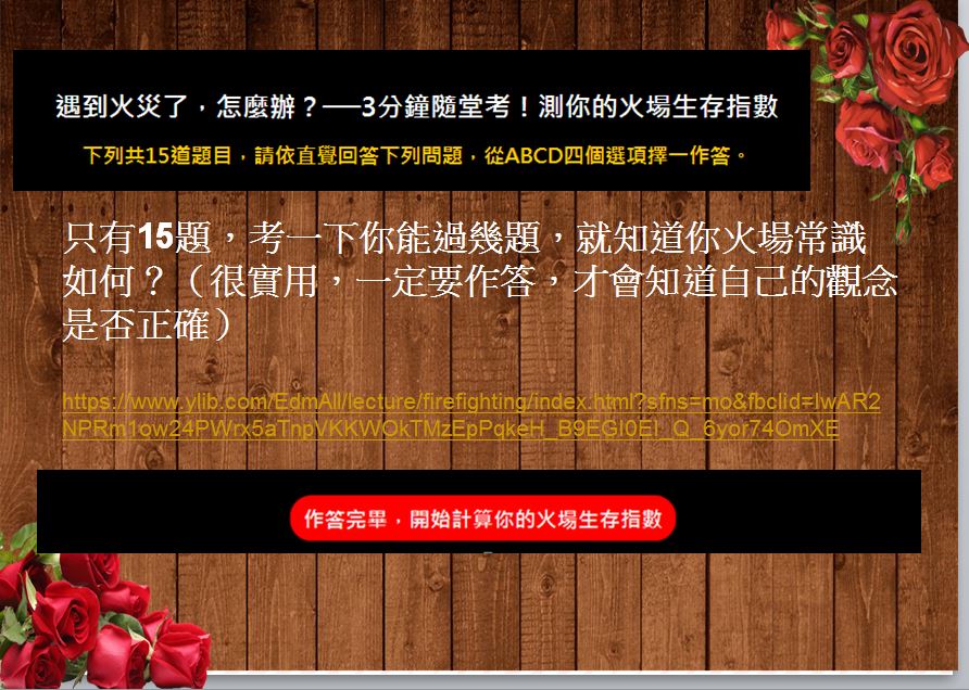 濃煙不只危險,擴散比飛還要快,一秒鐘可以向上竄升五、六公尺,許多人就在逃難的過程中被活活嗆死了。因此,學會火場求生的觀念很重要,在遇到緊急事故才有機會能順利脫逃。同仁可以到以下的網址去作答,只有15題,考一下你能過幾題,就知道你火場常識如何?(很實用,一定要作答,才會知道自己的觀念是否正確) https://www.ylib.com/EdmAll/lecture/firefighting/index.html?sfns=mo&fbclid=IwAR2NPRm1ow24PWrx5aTnpVKKWOkTMzEpPqkeH_B9EGI0EI_Q_6yor74OmXE