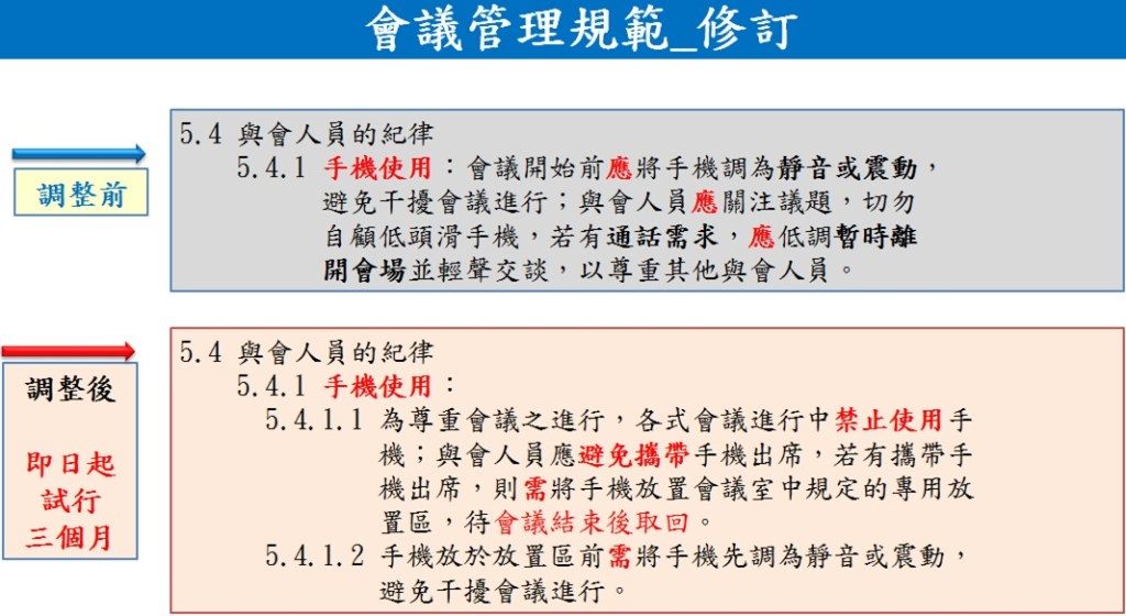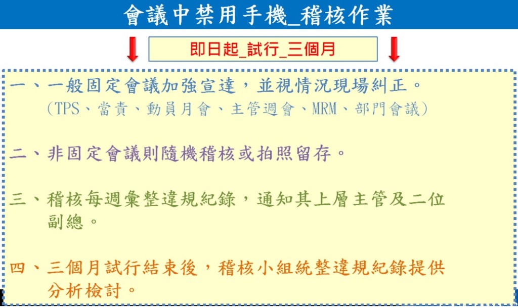 最後,林副總則對“會議中禁用手機”相關規範,對大家作一個宣達,請大家確實遵守公司的規定。
