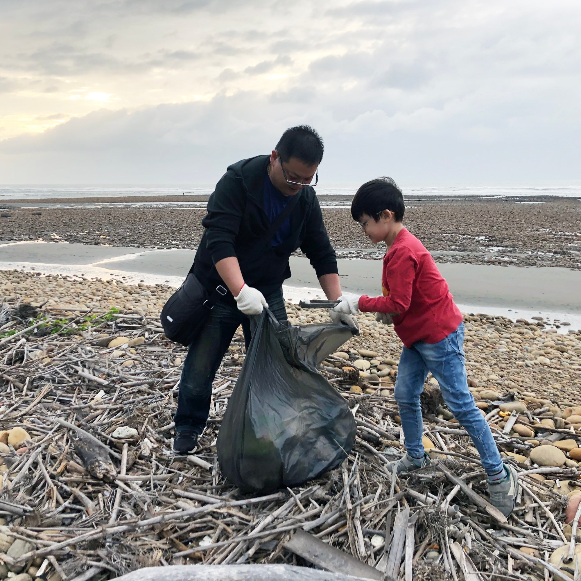 導覽完之後就是重頭戲的開始,大小朋友分工合作一起減垃圾,有人拿著麻布袋、有人則是帶著手套或夾子撿拾垃圾。在淨灘的過程中,我們撿到各種日常垃圾,甚至想都想不到的垃圾都有,可見這些物品的來源可能是因為我們亂丟垃圾,經由一連串的輾轉漂流而來到原本應該乾淨無瑕的海灘,當下心情其實是複雜的,因為人類的私心與便利,卻讓無辜的海洋或生物遭受迫害。老師說海邊的垃圾今天清完了,但明天一個浪打來可能又是滿地的垃圾,所以重點是從”源頭做起”,平常就要做好垃圾減量,儘量降低一次性塑膠的使用,比如說隨身帶上環保杯、購物袋,或是塑膠袋重複使用等,都有助於垃圾減量。原來只要小小的習慣改變就可以幫助到地球,甚至讓我們周遭的環境都會變得更加乾淨美好,我想這是每個人都可以做到的。