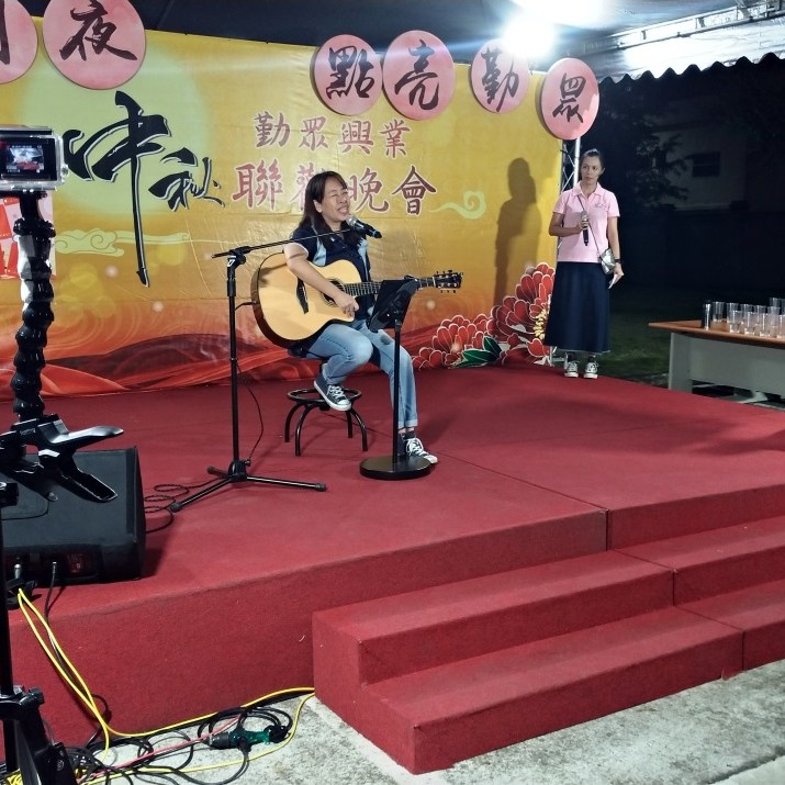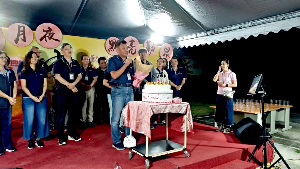 雖然今天因為天氣不穩故移師到停車場舉辦,但也因此拉近舞台與餐桌的距離,此次福委會特別幫每組上台表演者準備花束,許多同仁紛紛上台獻花,其中組裝課-陳玉世演唱"剛好遇見你",同仁除了獻花之外還有紅包,經主持人訪談中得知,組裝課的同仁說如果他上台唱中文歌就包紅包。倉管課-譚勝文是眾所皆知的勤眾歌王,曲畢台下的人大喊"安可",可惜今天他沒有準備安可曲,不過沒關係,他有答應主持人下次會準備。組裝課-任富美上台唱歌時,陳董事長也上去一起唱將活動帶至高潮。