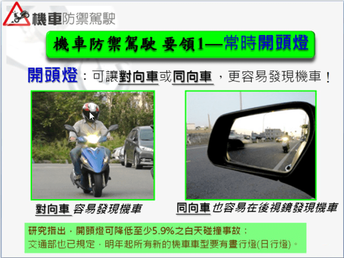 - 「守法」是確保自己不要成為肇事的一方,而「防禦」則是避免自身成為受害的一方。要保持一些警覺心,例如「不要以為別人有看到我」、「不要以為對方會禮讓」或「不要以為對方會煞停」等。