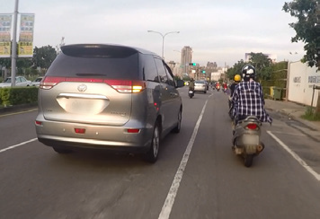 機車行駛於路上時最好遠離大車,預防大車右轉未注意到方向燈與內輪差。