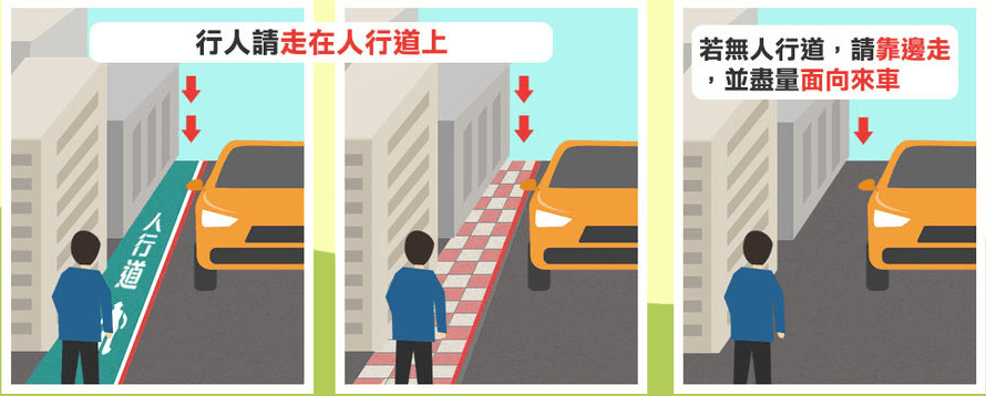 行人走在路上須走在人行道,若無人行道需靠邊走並面向來車。
