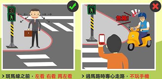 過斑馬線時不僅要看交通號誌,還要注意是否有未注意的來車過馬路時要專心,切勿划手機。
