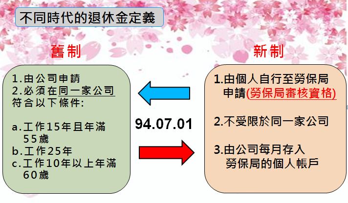 自94年7月1日起實施退休金新制,每個人在勞保局都有一個自己的帳戶,公司每個月幫員工提撥的退休金,都會存在自己的帳戶裡,不再受同一家公司的限制,也就是不會因為離職就領不到退休金。