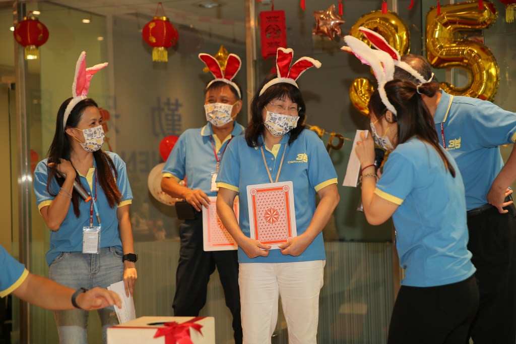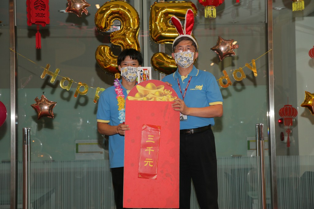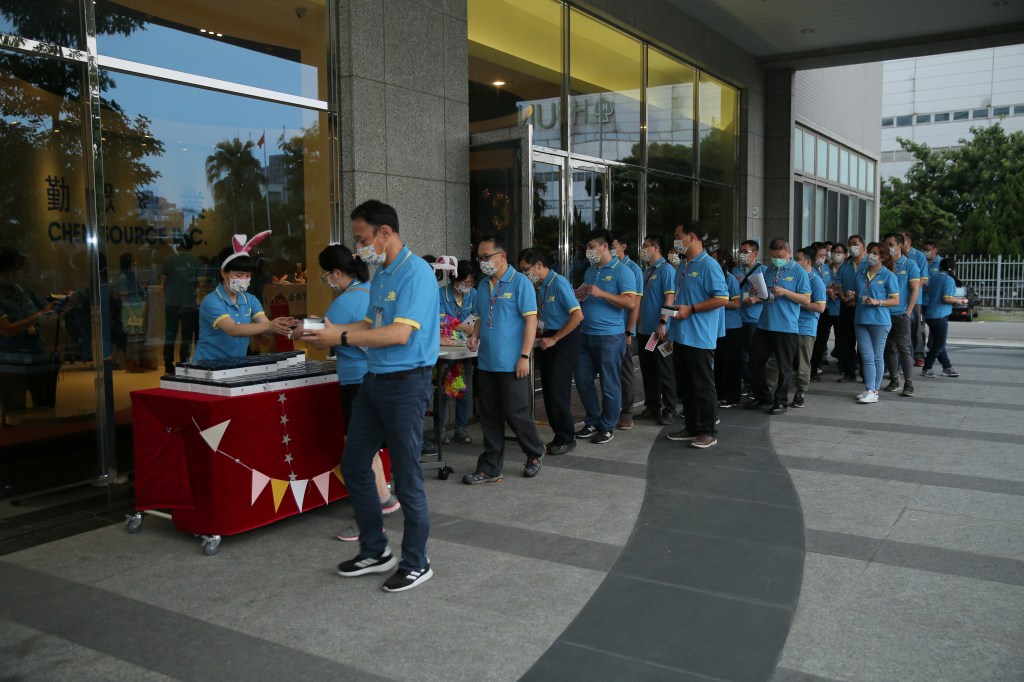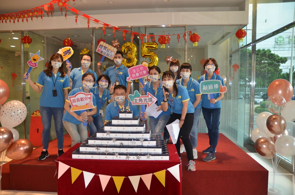 好在目前疫情較為趨緩,福委們開始籌備這次的企劃,為了落實防疫,將活動分了三個梯次,就是要讓每位同仁感受到歡樂的氣氛。 然而,今天一早進公司就發現跟往常不太一樣了,每個人換上35周年的紀念衫與戴上紀念口罩,整體顯得更有活力與朝氣,為傍晚的中秋活動拉開序幕。