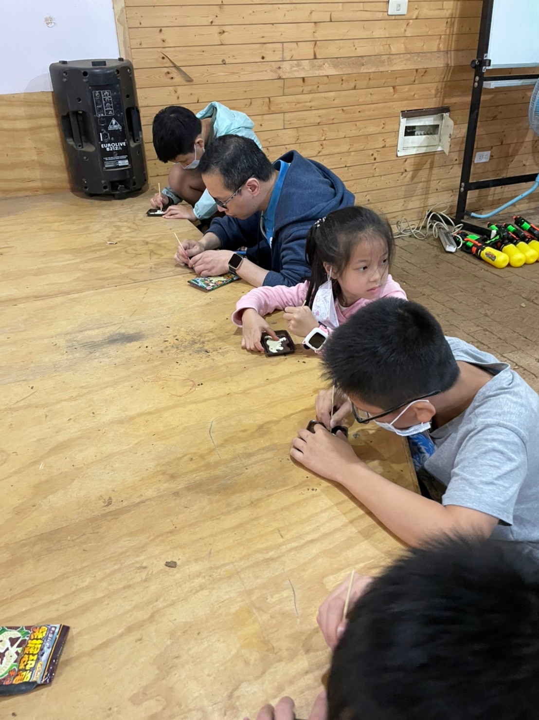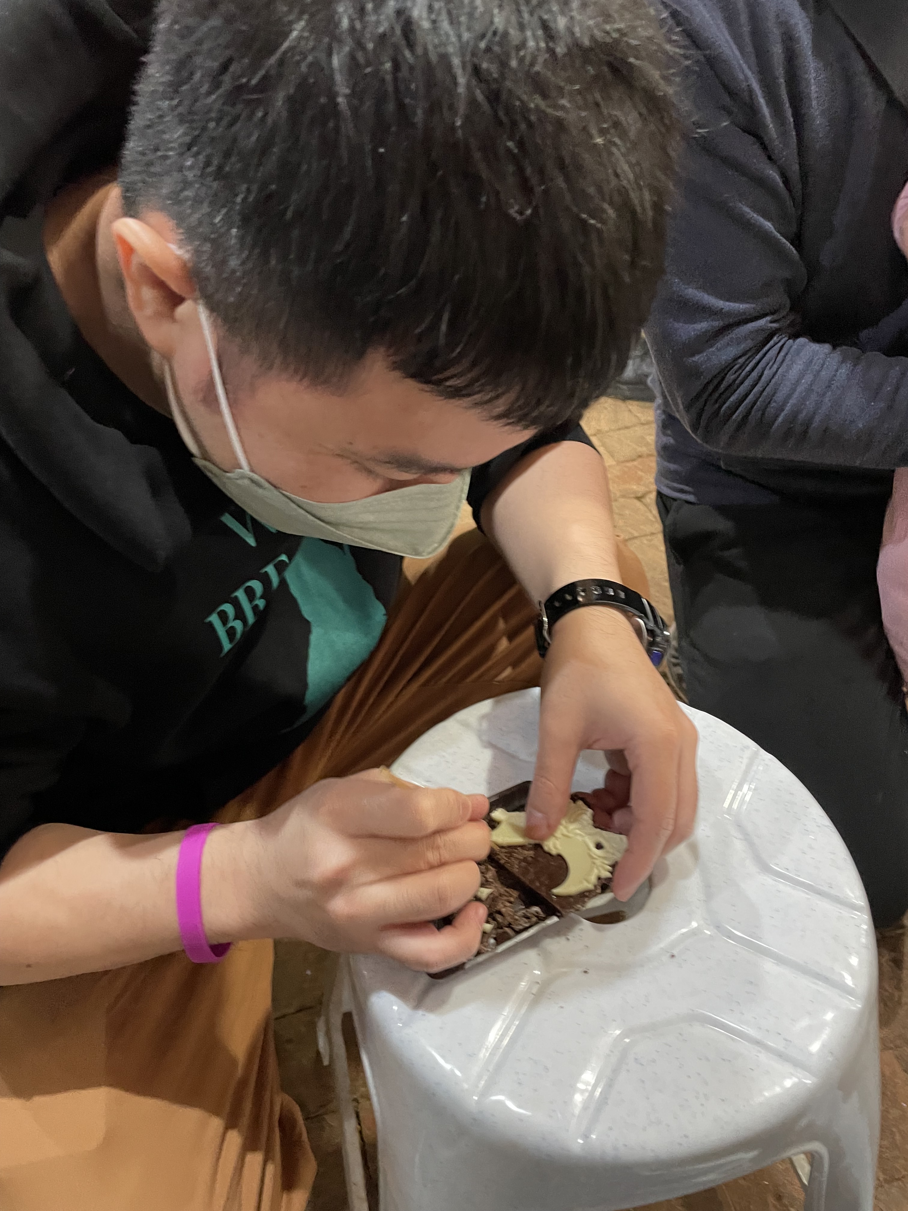 等候窯烤的時間,來到室內進行團康競賽,每個遊戲都能換取不同的金幣數,看看哪個小隊拿到最多金幣。小隊歡呼大小聲看誰最有精神,比比看比長?比多?比劈腿?,最後是現在最流行的魷魚遊戲—刻糖餅,巧克力不小心就剉破了,乾脆吃掉它。最後,由粉隊得到第一名獎金一萬元!