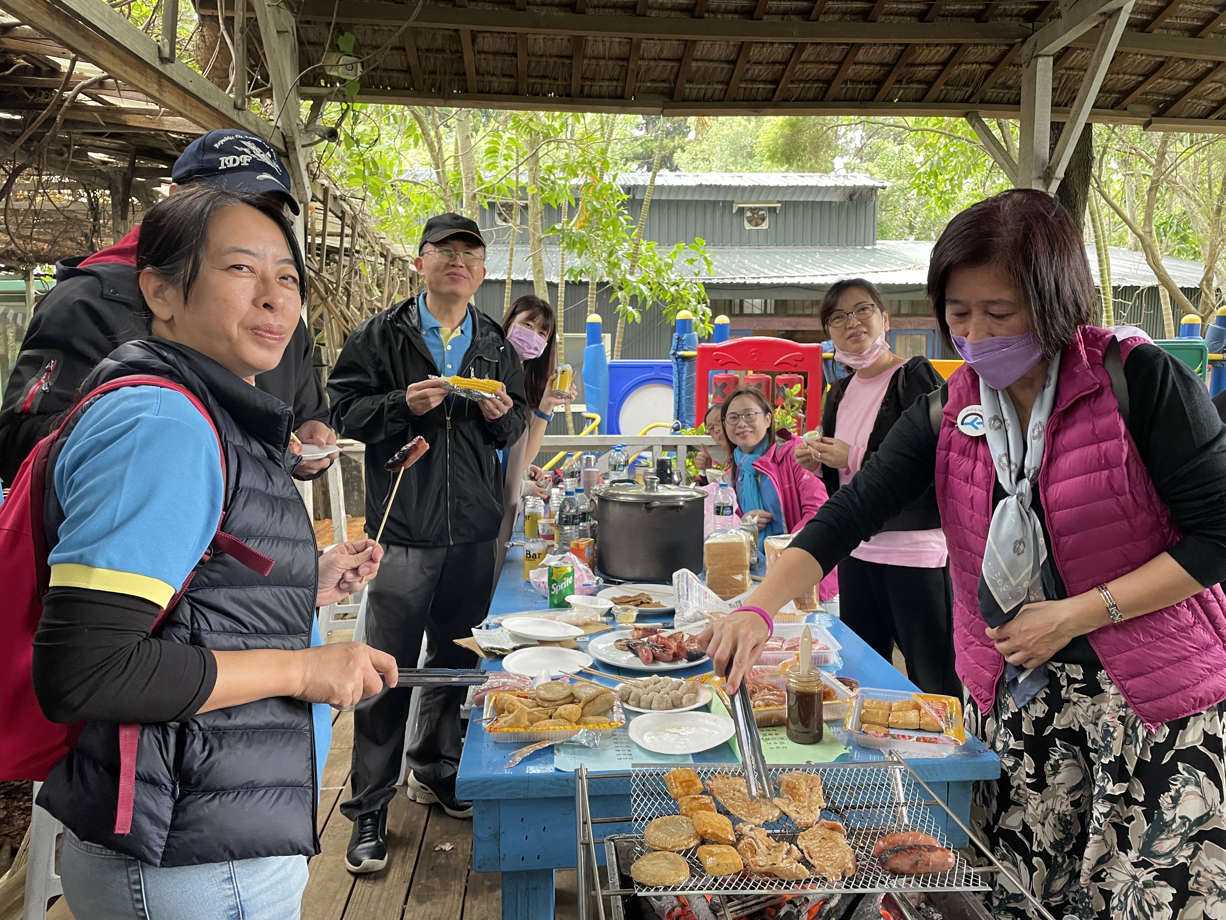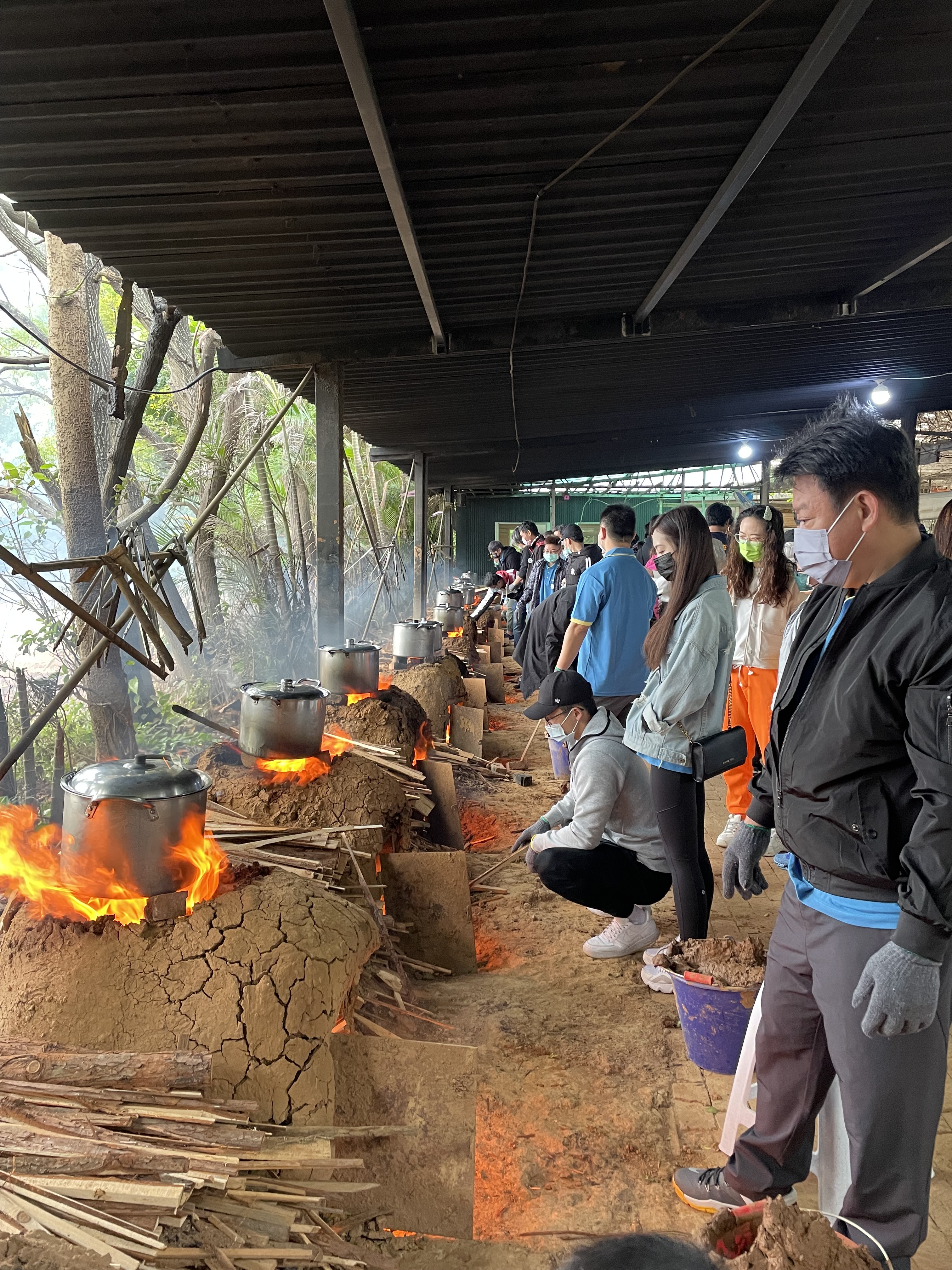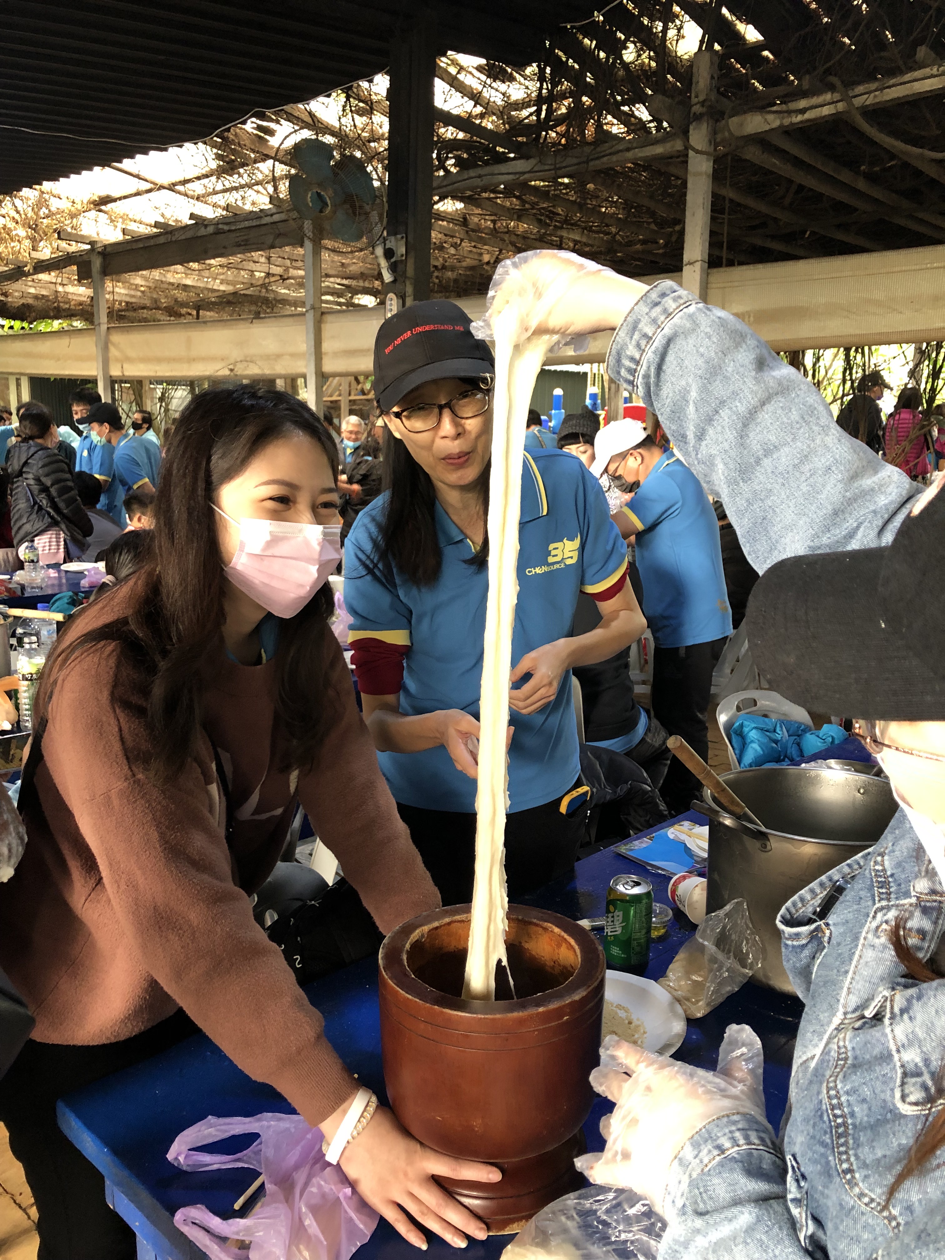 烤肉開始,起火就是個考驗,還好有大噴槍幫忙,發現大家烤肉技術都很好,沒有焦黑碳烤味。福委會怕大家餓,給了滿滿的烤肉食材外,還有一大早焢窯的地瓜、玉米、雞腿、魚和蛋,跟大鍋好吃的蘿蔔丸子湯。沒想到,最後再來一個搗麻糬,飯後點心,吃的飽飽飽。