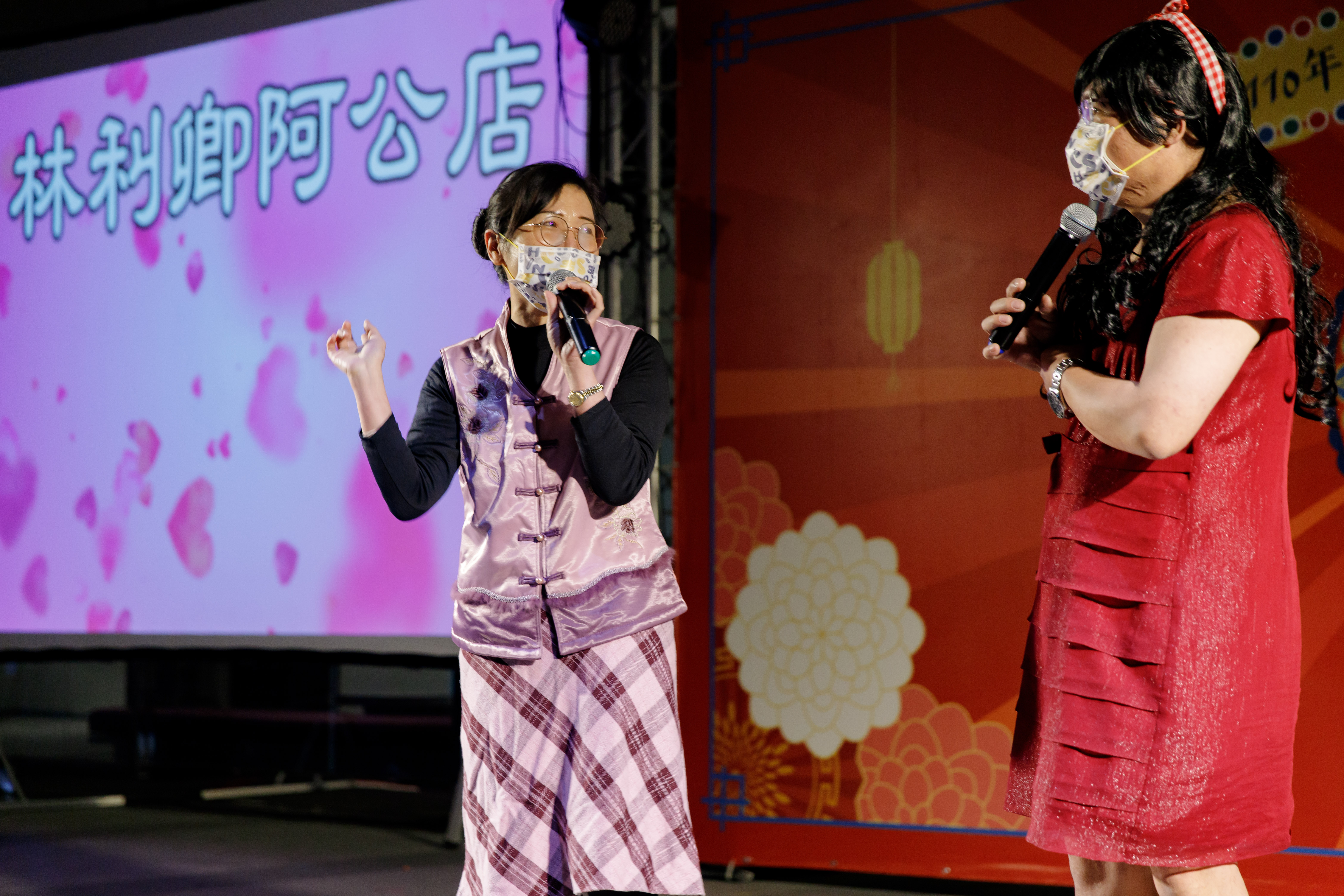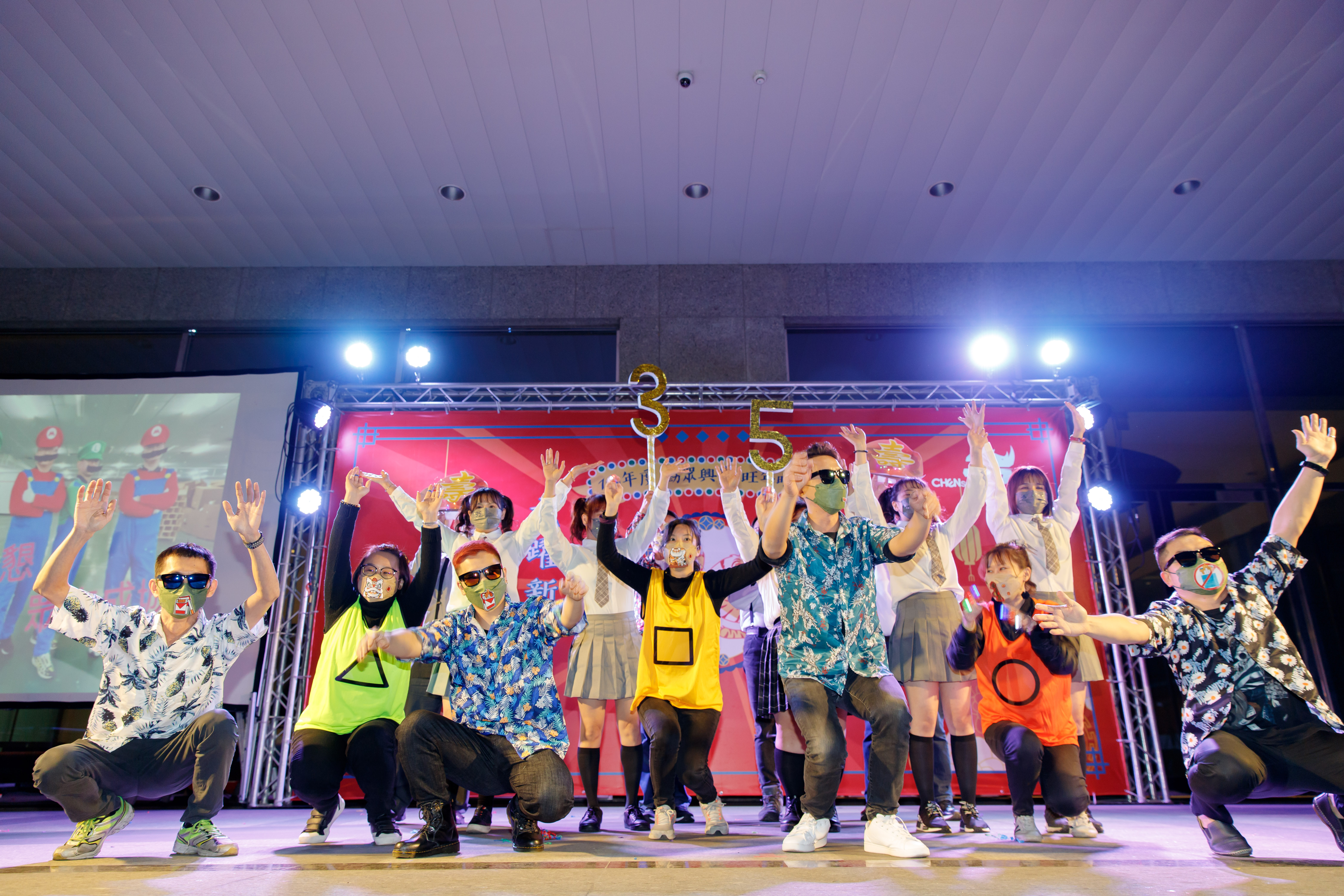員工表演,今年分成一、二、三樓,除了復古主題外,也有人以今年最紅話題魷魚遊戲為造型。由一樓演出的『林利卿阿公店』有別以往只有跳舞,而是由歌舞劇的方式演出〝為著十萬塊〞大大受到掌聲,你看出主角是誰了嗎?