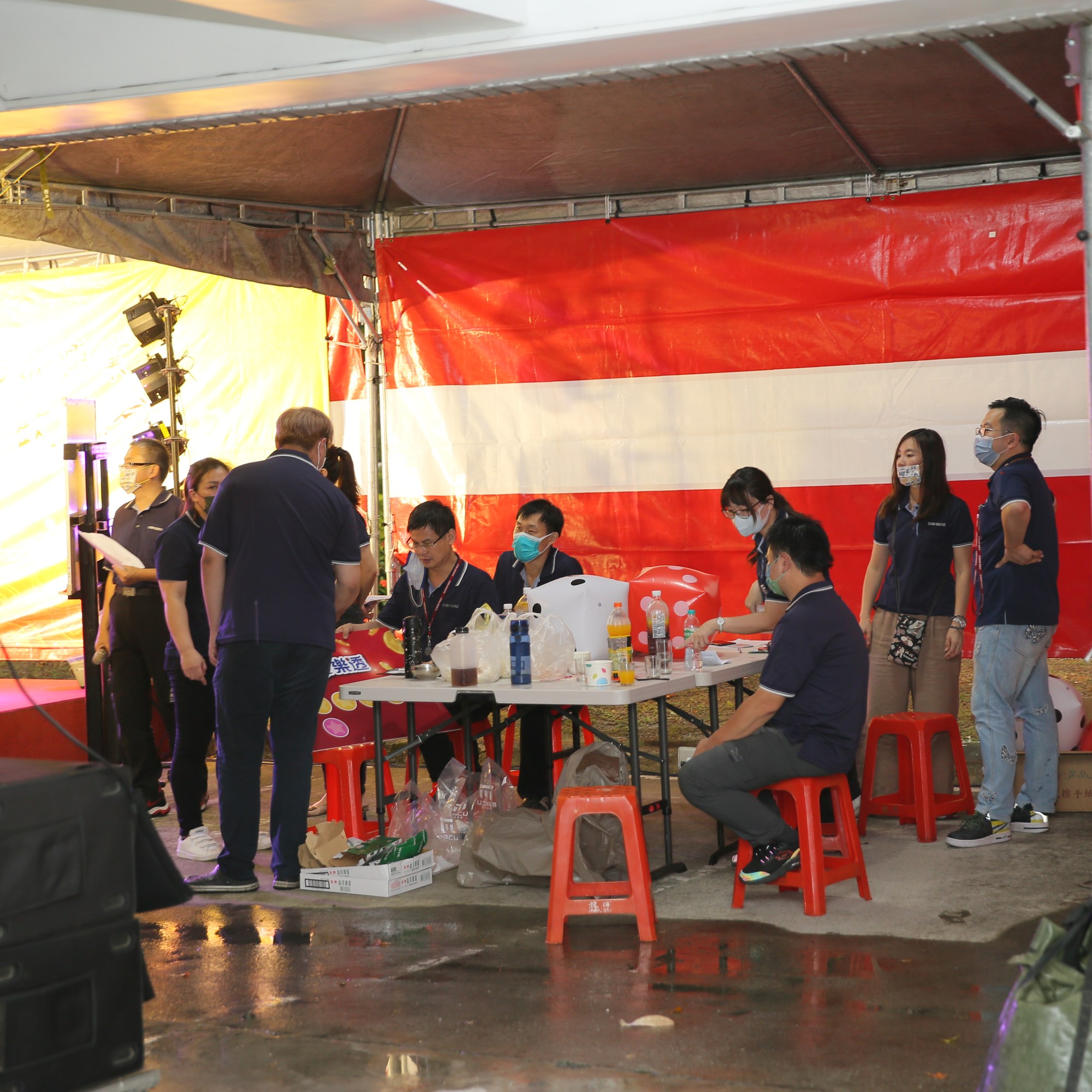 當天,隨著軒嵐諾颱風的逼近,雨勢開始漸漸地增加,這也使得各位福委會委員們內心忐忑不安,深怕雨勢和風勢會影響場地的安全和活動的進行,但是為了能讓員工們能夠安心地參與晚會,委員們還是很認真地佈置會場,希望活動能順利地進行,圓滿地結束。