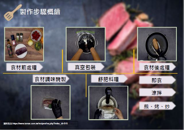 舒肥法全名為「真空低溫烹調法」,是由法文Sous Vide直接翻譯過來的。在進行低溫烹調之前需要先將食材放入袋中抽真空密封,再來放入恆定溫度的水中長時間的烹煮它,讓食材均勻受熱緩慢熟成,保存本身的風味。