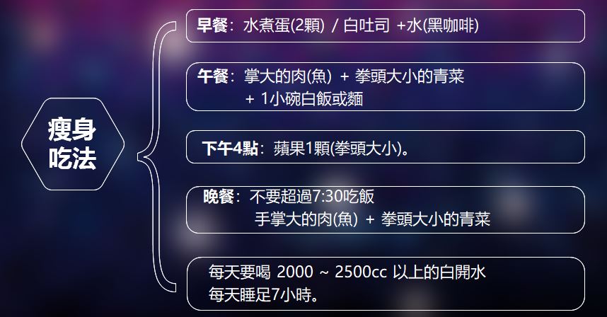 實際減重經驗分享(by張特助):適量的飲食,讓我每餐有肉有菜也能瘦,再加上每天搭配足夠的水份及睡眠,讓我二個月瘦了16公斤。