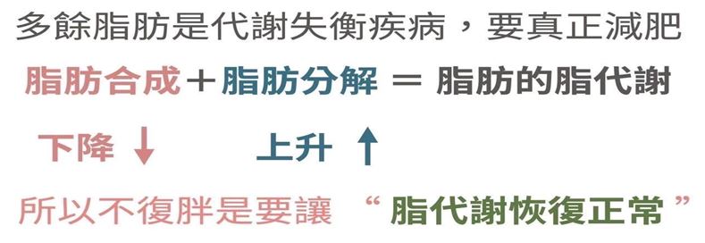 體重變輕不等於減肥!肥胖是多餘能量儲存在脂肪細胞裡,減肥是減掉已經存在身體的多餘脂肪。 多餘脂肪是代謝失衡疾病,真正的減肥要做到脂肪合成下降,脂肪分解上升,讓脂代謝恢復正常,才能做到不要復胖。