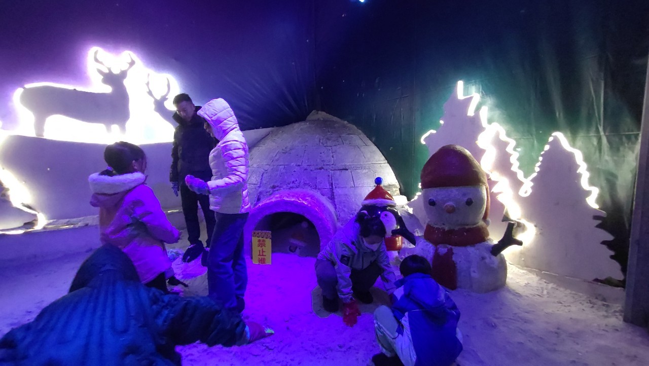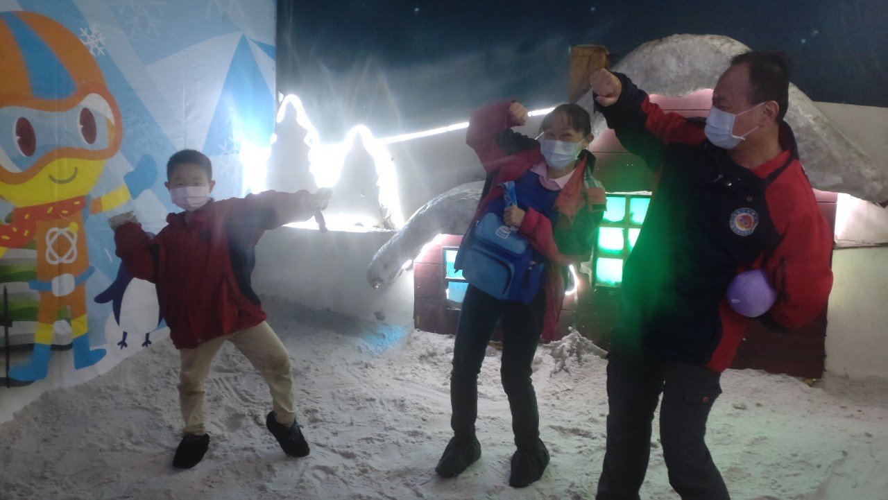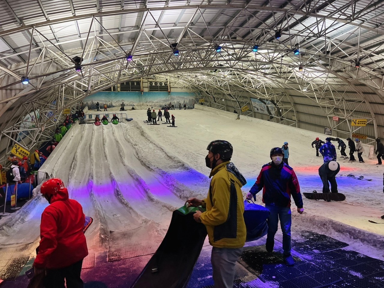 下午的第一場活動,來到小叮噹科學樂園近年最受歡迎的【滑雪場】,滑雪場內溫度為零下-3 ℃~-8 ℃,從炎熱的戶外進到室內再進去雪場,不穿厚外套根本受不了。看到右邊是專業的雪板練習場,而我們這種幼幼班的,就玩左邊的雪毯滑雪道享受極凍飆雪快感。在玩雪區裡,忍不住就會想抓起地上的雪來丟人,有小朋友在挖山洞堆雪人。